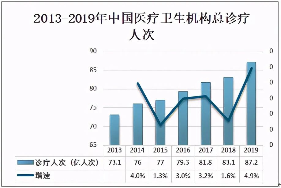 据中国卫生年鉴数据显示,2018年中国医疗卫生机构总诊疗人次为83.1亿人次,同比增长1.6%;2019年中国医疗卫生机构总诊疗人次为87.2亿人次,同比增长4.9%。