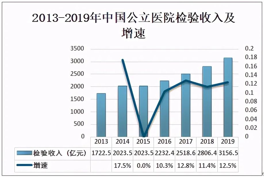 随着经济发展水平、居民健康意识提高,居民消费结构不断升级,高收入群体已不满足于常规医学检查,高端检验如基因组学检验需求持续增加。中国公立医院检验收入为3156.5亿元,同比增长12.5%。