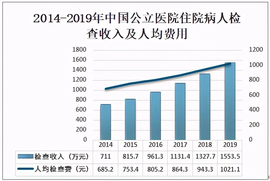 其中,2019年中国公立医院住院病人检查收入为1553.5亿元,同比增长17%;中国公立医院住院人均检查费为1021.1元,同比增长8.2%。