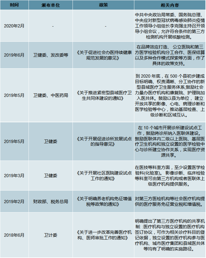 国务院和卫计委等相关部门出台多项政策,明确提出鼓励和支持社会力量举办医学检验机构、大力发展第三方服务。