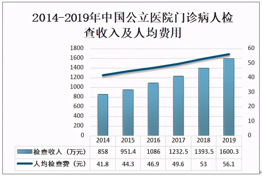 其中,2019年中国公立医院门诊病人检查收入为1600.3亿元,同比增长14.8%;中国公立医院门诊病人人均检查费为56.1元,同比增长5.8%。