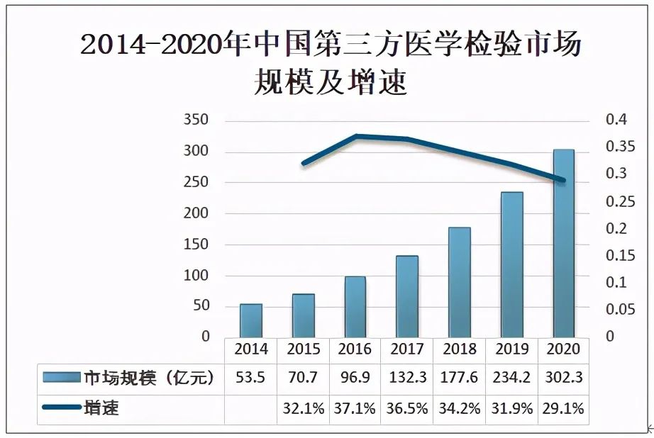在医疗控费等政策的驱动下,医疗机构开始选择与第三方医学检验实验室合作,从而降低检验成本,维持利润水平,因而第三方医学检验实验室的单店规模不断扩大。2020年中国第三方医学检验市场规模为302.3亿元,同比增长29.1%。