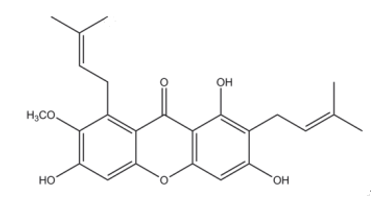 α-倒捻子素(α-MG)是从藤黄科藤黄属植物山竹(Garcinia mangostana L.)果壳中分离获得的呫吨酮类化合物,其结构如下图所示。药理实验证明,α-倒捻子素具有抗炎、神经保护等作用,其中可通过抑制炎症反应、抗氧化应激、抗神经元凋亡等多个环节,在阿尔茨海默病(AD)、帕金森病以及抑郁症(PD)、自闭症、血管性痴呆、精 神分裂症中发挥多靶点的神经保护作用。