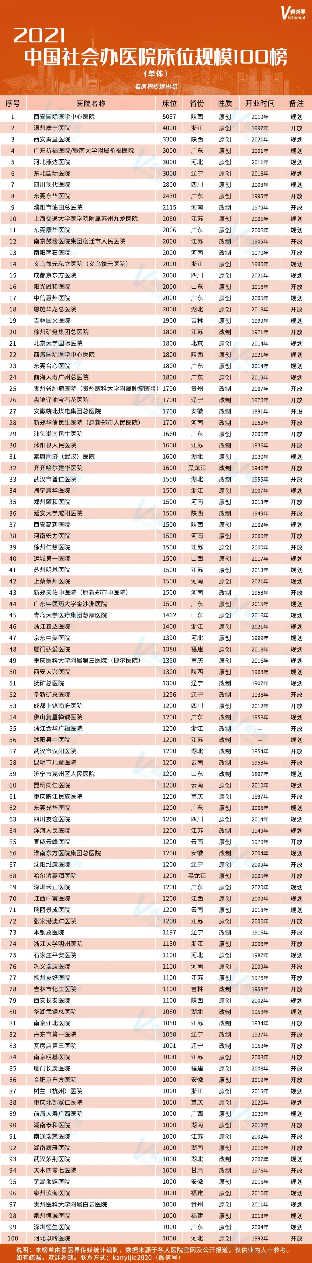 《看医界》制作的《2021中国社会办医院床位规模百强榜》显示:中国社会办医已呈现出规模化态势,大综合、强专科现象突出,大型上市资本进入医疗服务行业成为风向,向规模要可持续发展能力。