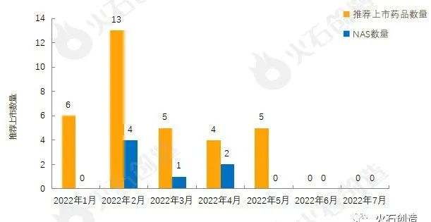 截至2022年8月5日EMA官网披露,2022年1月至7月的推荐上市药品及新活性物质(NAS)数量情况见图2。2022年7月EMA未推荐药品上市。