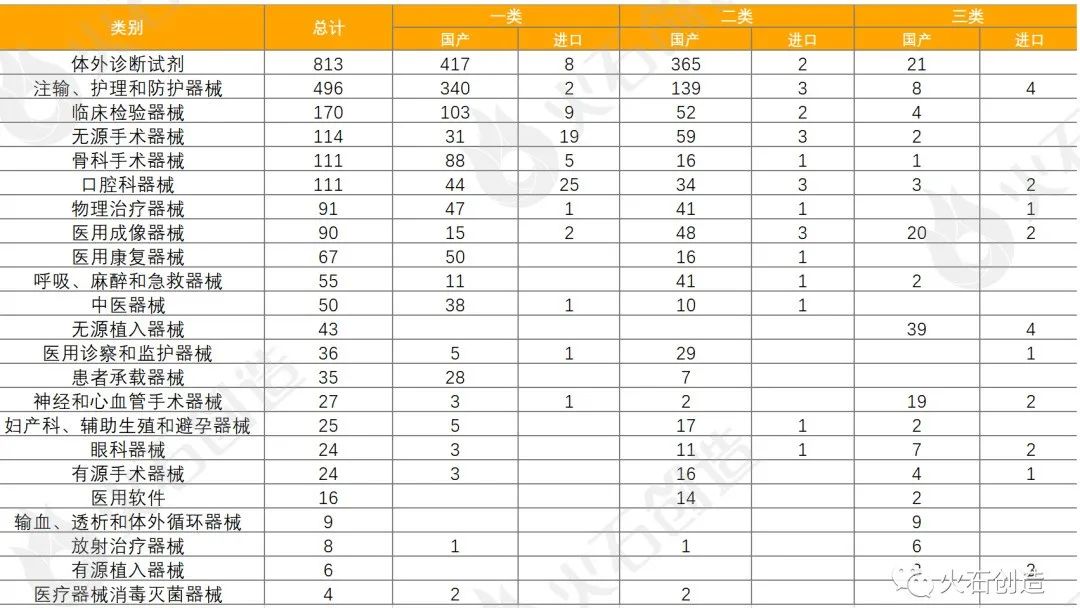 统计数据显示,体外诊断试剂数量最多,共813项,占33.53%,基本上均为国产,为803项。除体外诊断试剂,批准注册类别数量排前三位的分别为注输、护理和防护器械,临床检验器械和无源手术器械。