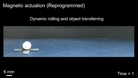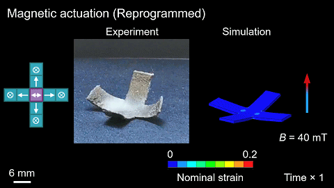 在材料变为粘稠半液体状态后,硬磁颗粒就能在基底中自由旋转。即增加外界磁场,即可调整微粒的指向,这也正是原位编程的概念。