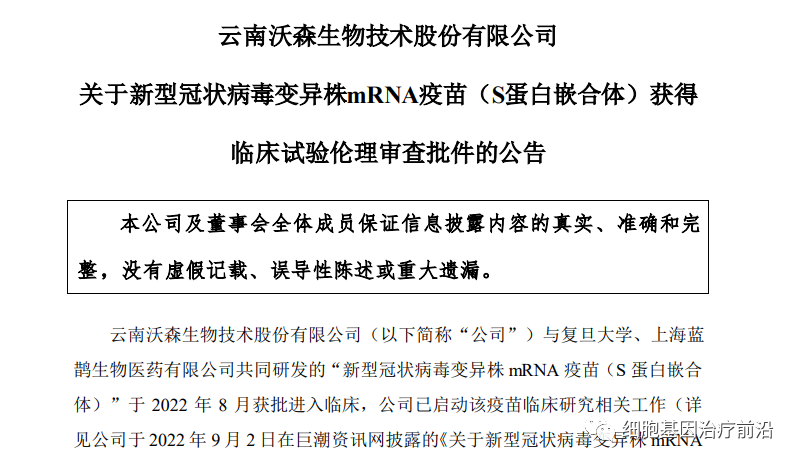 沃森生物11月3日公告,公司与复旦大学、上海蓝鹊生物医药有限公司共同研发的“新型冠状病毒变异株mRNA疫苗(S蛋白嵌合体)”于2022年8月获批进入临床,公司已启动该疫苗临床研究相关工作。