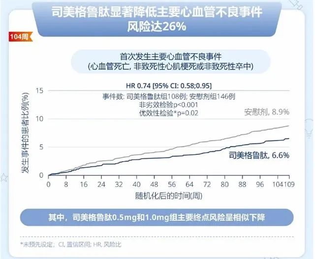 除了显著的降糖作用外,命名为SUSTAIN 6的研究证明司美格鲁肽对2型糖尿病患者的心血管结局具有显著益处,相比安慰剂,显著降低主要心血管不良事件风险达26%,显著降低非致死性卒中风险达39%,并可显著改善患者体重、血压、血脂等多项指标,为患者带来心血管代谢综合获益。因此,FDA和NMPA都批准了司美格鲁肽用于降低伴有心血管疾病的2型糖尿病患者的主要心血管不良事件风险。