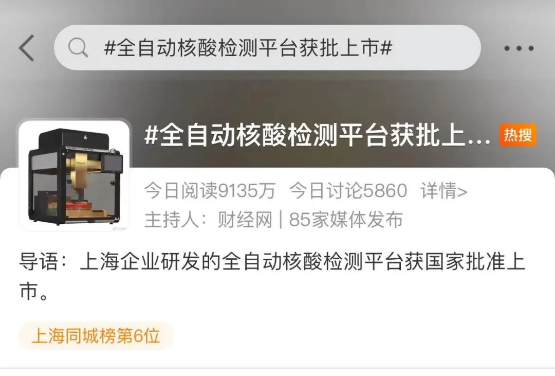 上海企业研发的全自动核酸检测平台获国家批准上市。