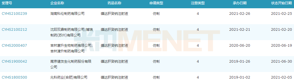 目前国内有5家企业以仿制4类提交磺达肝癸钠注射液上市申请,其中兆科药业、南京健友的产品已获批生产并视同过评,兆科药业为首家过评企业;此外,恒瑞医药、扬子江/信泰制药提交该产品一致性评价补充申请,目前还在审评审批中。
