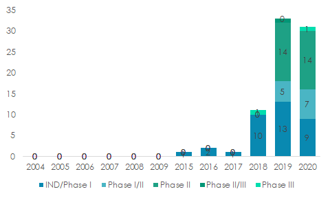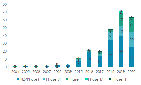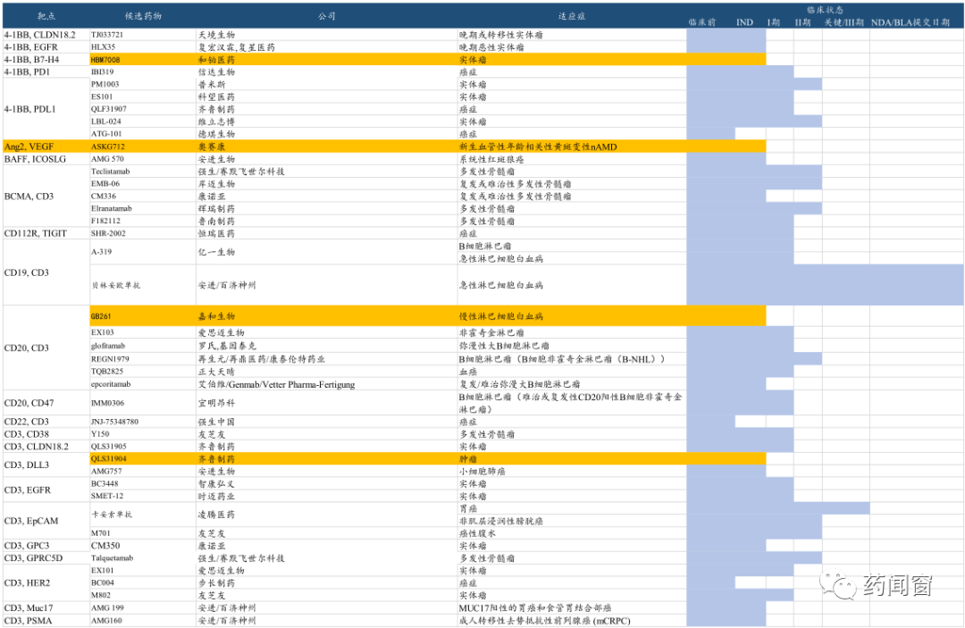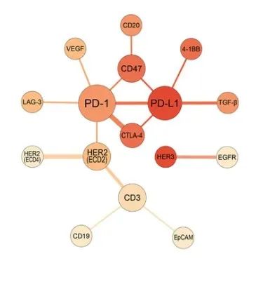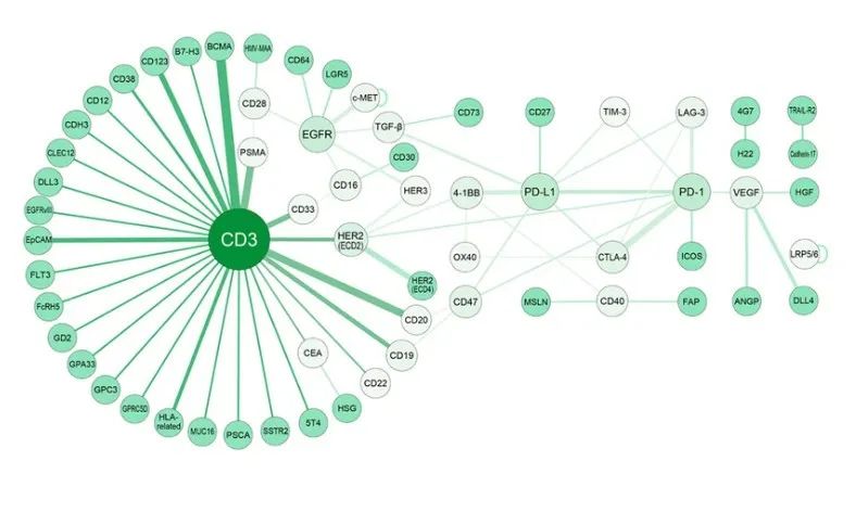 双抗药物全球研发进展根据不完全统计,截至2021-07-24,全球共有980款双抗药物,除去处于暂停、终止和没有研发状态更新的药物以外,目前处于有效研发阶段的双抗药物共有712个,其中处于临床前和发现阶段的项目数占比超过75%,处于临床阶段的项目数仅占24%。根据Journal of Hematology&Oncology的一篇文献,2020年检索到272个有关双抗药物研究的临床试验。29%的研究来自中国机构,仅次于美国,排名第二。双抗药物的临床试验主要集中在I期、I/II期和II期, III期临床试验数量仍然很少。从靶点和MOA角度,全球主要关注靶向CD3靶向的双抗,MOA为T细胞重定向;而国内研究更多靶向PD-1/PD-L1,MOA为双免疫检查点阻断。