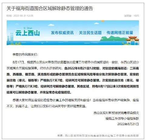 8月17日,根据西山区应对新型冠状病毒肺炎疫情工作领导小组指挥部统一安排,在西山区部分区域围合开展核酸筛查。经综合评估研判,自2022年8月21日12时起,对划定的福海街道:二环南路、西福路、福景路、滇池路形成的静态管理围合区域根据风险等级分批次解除静态管理。密接的居住地(单元、楼栋等)严格执行7天7检,经研判方可解除静态管理。次密接的居住地(单元、楼栋等)严格执行7天3检,经研判方可解除静态管理。其他区域,持有8月17日以来3次核酸检测阴性结果可以解除静态管理,并恢复常态化疫情防控。