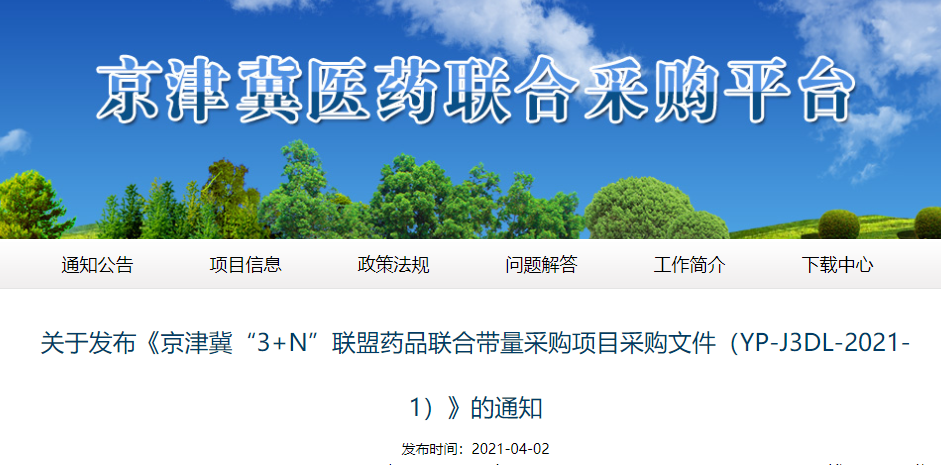 4月2日,京津冀医药联合采购平台发布《京津冀“3+N”联盟药品联合带量采购项目采购文件》,通知标识,北京、天津、河北、山西4省市将针对11个品种开展带量采购。4月15日正式开标。