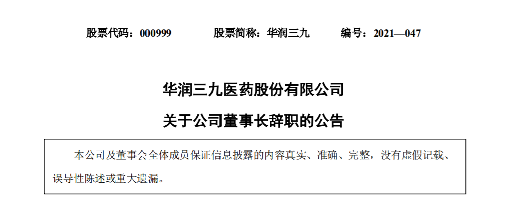 12月3日,华润三九发布公告称,董事会收到董事长王春城提交的辞职报告,由于工作变动原因,王春城提请辞去董事长、董事职务,辞职后不再在华润三九担任职务。