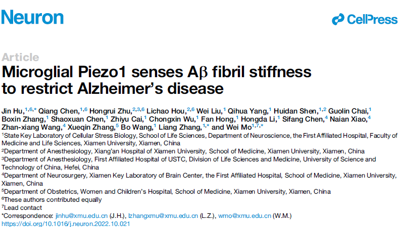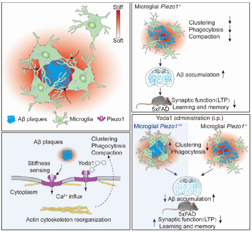 揭示了小胶质细胞通过机械力受体Piezo1感知纤维化Aβ硬度而激活,并显著改善AD相关病理变化。