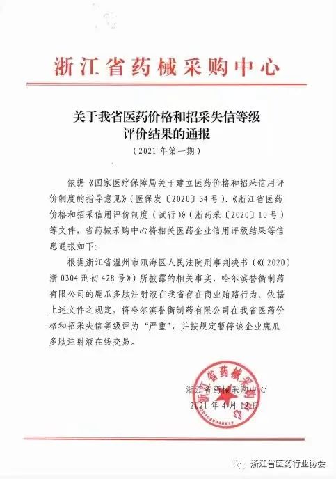 4月12日,浙江省药械采购中心发布通报称,浙江省药械采购中心发布的《关于我省医药价格和招采失信等级评价结果的通报(2021年第一期)》称,将哈尔滨誉衡制药有限公司在浙江省医药集中采购市场的价格和招采失信等级评定为“严重”,并暂停该企业鹿瓜多肽注射液在浙江省挂网交易,成为全国首例信用评价达到“严重”等级的治理案例。