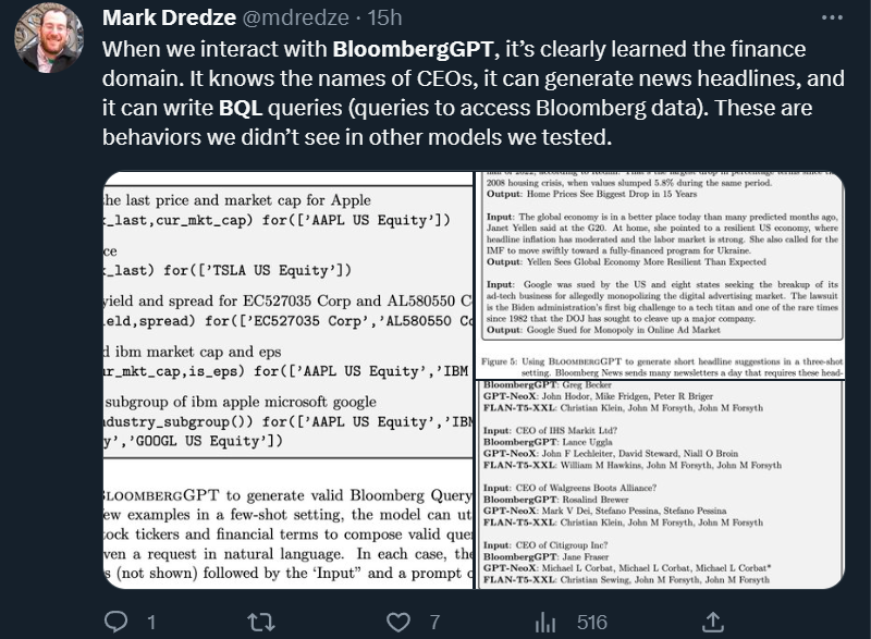 试用者表示,「这个模型知道 CEO 的名字,可以生成新闻标题,可以编写 BQL 查询(访问彭博数据的查询)。这些行为在我们测试的其他模型中没有发现。」