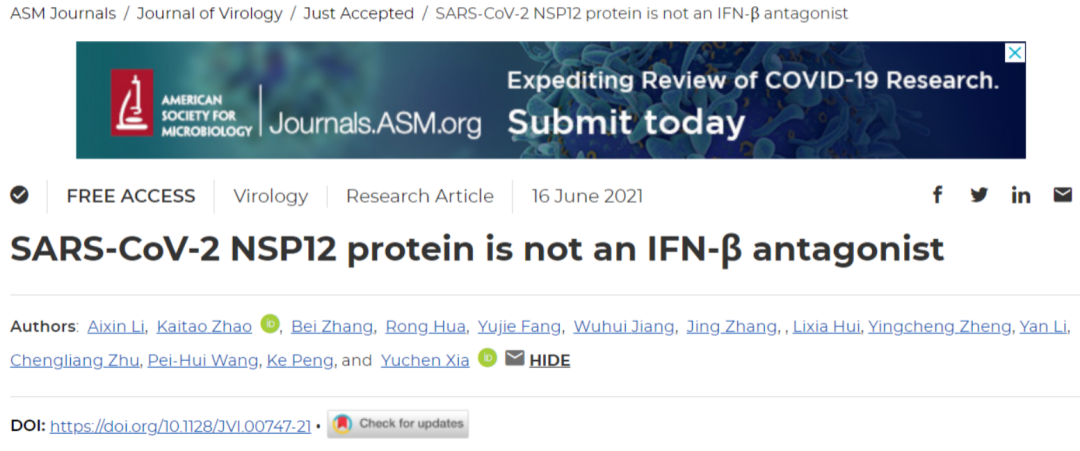 近日,国际学术期刊Journal of Virology在线发表了病毒学国家重点实验室/武汉大学基础医学院医学病毒学研究所夏宇尘研究组的最新研究成果,论文题目为“SARS-CoV-2 NSP12 protein is not an IFN-β antagonist”。