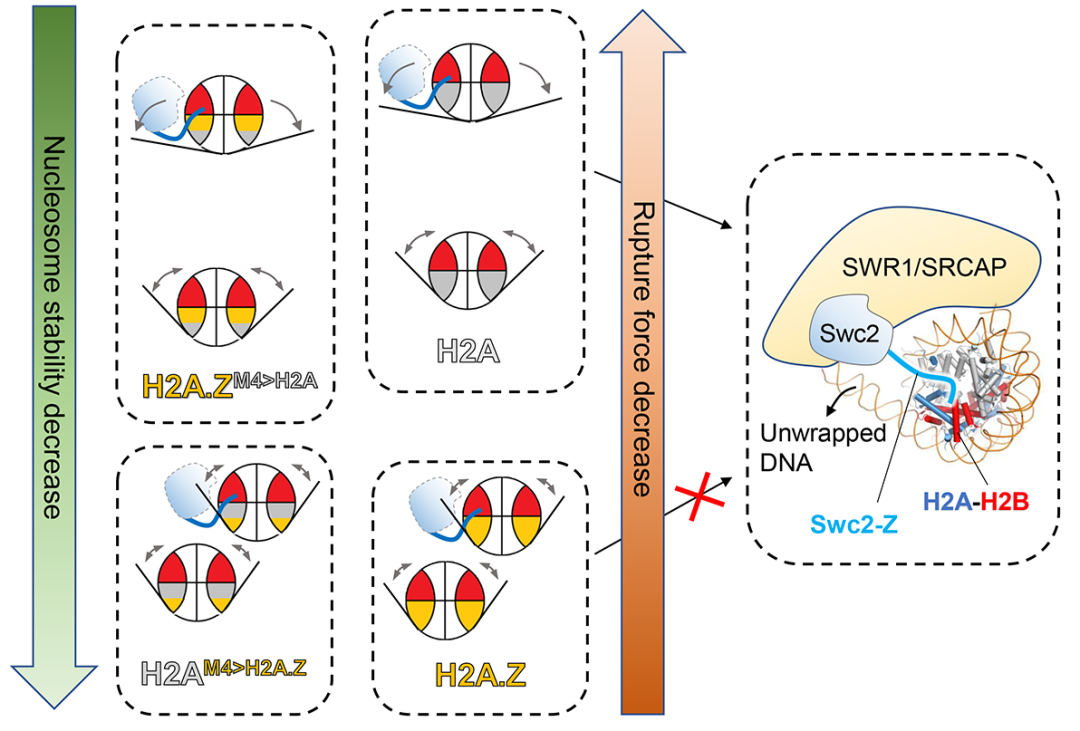 H2A.Z是组蛋白H2A的一类变体。酵母及哺乳动物细胞中的H2A.Z具有高度保守的序列,并且在基因转录、DNA复制、基因组稳定性维持等过程中发挥重要作用。H2A.Z通过精确定位于基因组的特定位点来改变染色质结构并实现其功能。SWR1/SRCAP催化的H2A.Z替换反应可以将H2A.Z核小体精准地定位到正确的染色质区域,又被称为“核小体编辑”。中科院生物物理所周政课题组近年来围绕该课题开展了系统研究,先后探明了SWR1/ SRCAP介导H2A.Z进入核小体(Nat Struct Mol Biol, 2016),以及将H2A移出核小体(PNAS, 2020)的过程;发现了组蛋白伴侣介导H2A.Z进行染色质递送(PLoS Biol, 2019)以及染色质移除(Cell Res, 2014)的方式,从而初步阐明了SWR1/ SRCAP与组蛋白形式的H2A.Z进行作用的分子机制。然而,仅有组蛋白形式的H2A.Z并不能激活SWR酶体进行H2A.Z替换,H2A.Z替换还需要H2A核小体这个关键的激活因子。SWR1/SRCAP如何区分底物与产物,以确保H2A.Z交换反应单向性的内在机制尚不清楚。