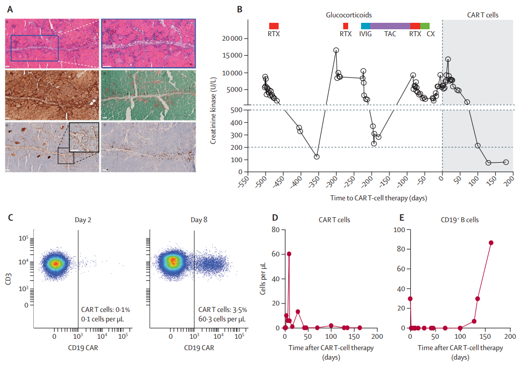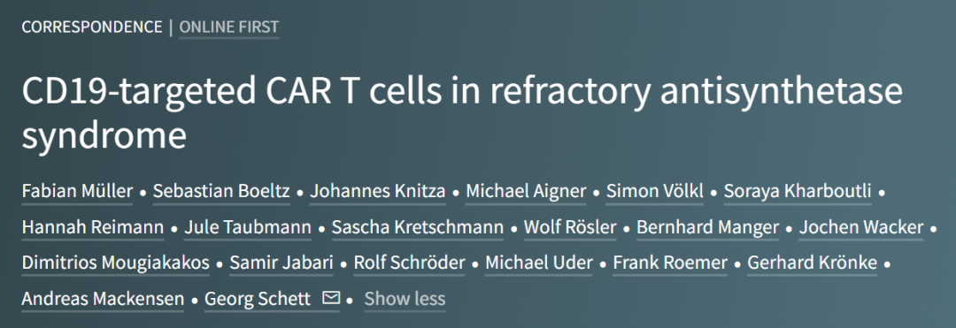 近日,德国埃尔朗根-纽伦堡大学风湿病学和免疫学系主任 Georg Schett 教授等人在《柳叶刀》期刊发表了题为:CD19-targeted CAR-T cells in refractory antisynthetase syndrome 的论文【1】,描述了这名患者的治疗情况。