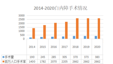 白内障目前手术是唯一的治疗手段,中国白内障的主要治疗方向包括超声乳化以及晶体置换,2020年中国白内障的数量人数高达383万人,同比增长2.7%,中国白内障百万人口手术率高达2662。