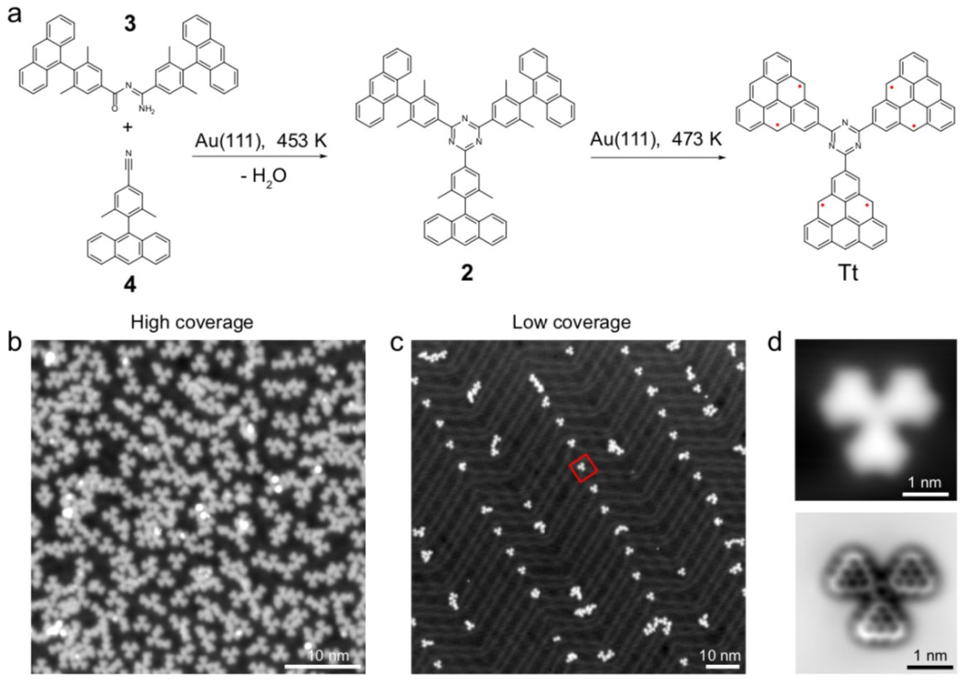 该团队介绍,“通过将溶液中获得的二聚体和带有氰基的单体共蒸镀到 Au(111)衬底上时,在 453K 的温度下退火,可以发生表面催化的脱水反应,并形成了额外的三嗪环结构,再在 473K 条件下退火发生环化脱氢反应,就能够成功制备出三嗪环连接的三角烯三聚体产物分子。”