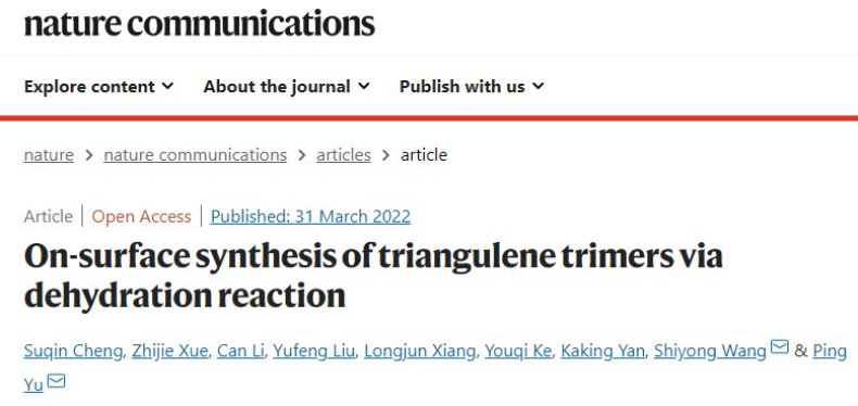 1、Cheng, S., Xue, Z., Li, C. et al. On-surface synthesis of triangulene trimers via dehydration reaction. Nat Commun 13, 1705 (2022). https://doi.org/10.1038/s41467-022-29371-9