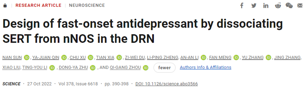 Nan Sun et al. Design of fast-onset antidepressant by dissociating SERT from nNOS in the DRN, Science, 2022, doi:10.1126/science.abo3566.