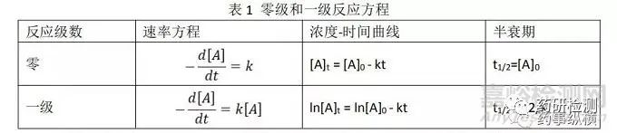 一般认为,在药物中的化学反应,尤其是在降解反应的早期,从表观反应速率上看,大多数符合零级反应或一级反应,即所谓的假零级反应或假一级反应,相关的速率方程如表1所示。