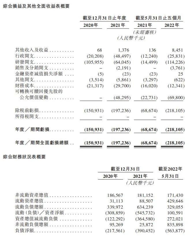 招股书显示,2020年、2021年及2022年前5月,真实生物其他收入及收益分别是6.8万元、137.6万元、845.1万元,其间分别亏损1.51亿元、1.97亿元、2.18亿元。两年5个月时间,真实生物累计亏损5.66亿元。