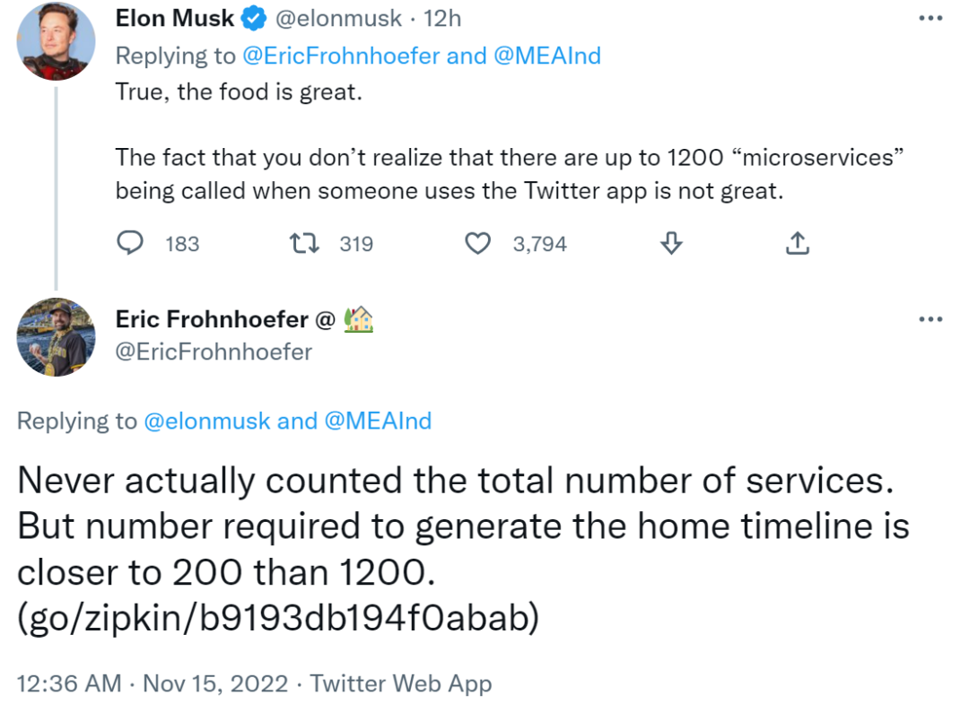 Frohnhoefer 再次反驳了马斯克的观点,并表示「从未真正计算过服务的总数,但生成主页时间线所需的数量大约是 200 ,而不是 1200 个。」