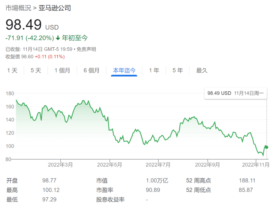 自年初至今,亚马逊股价也接近「腰斩」,跌幅超过了 42%,当地时间周一下午收盘时报 98.49 美元。