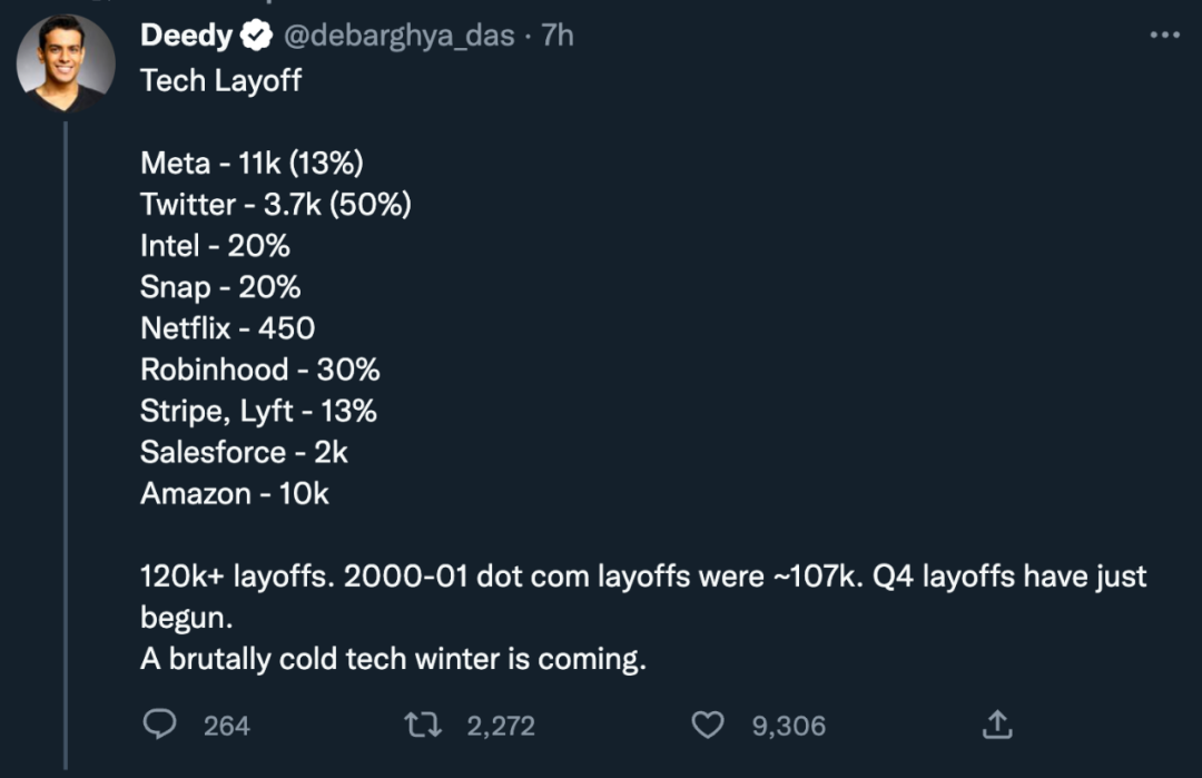 加上今天曝出的亚马逊,美国科技企业这波裁员潮正在如火如荼地进行中。有人做了一份企业裁员汇总,可以看到 Meta、Twitter、Intel、Snap、Netflix、Robinhood、Lyft、Salesforce 等的身影。