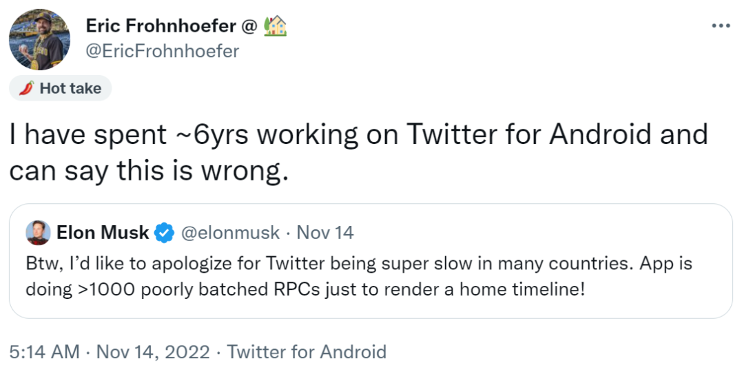 马斯克的这一做法随即引来员工 Frohnhoefer 的不满,Frohnhoefer 发文回击,表示他花了六年的时间为安卓版推特做研发工作,马斯克的说法是不正确的。