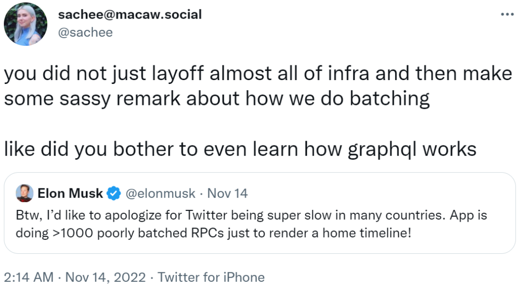 不止 Frohnhoefer,马斯克还收到了其他 Twitter 员工的反对。自称为 Twitter 技术负责人的 Sasha Solomon 引用了马斯克原始推文,指出马斯克不了解 GraphQL 是如何工作的,也不知道 Twitter 的基础设施是如何运作的。